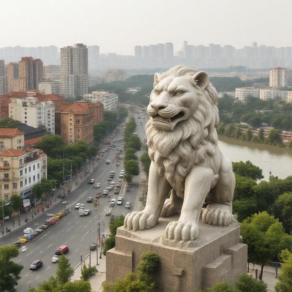 "Generate a realistic image of Cangzhou city in Hebei province, China, showcasing its urban landscape, possibly with the Cangzhou Lion Sculpture in the foreground, surrounded by buildings and streets, with a hint of the Hai River in the background, under a clear sky with a humid continental climate atmosphere."