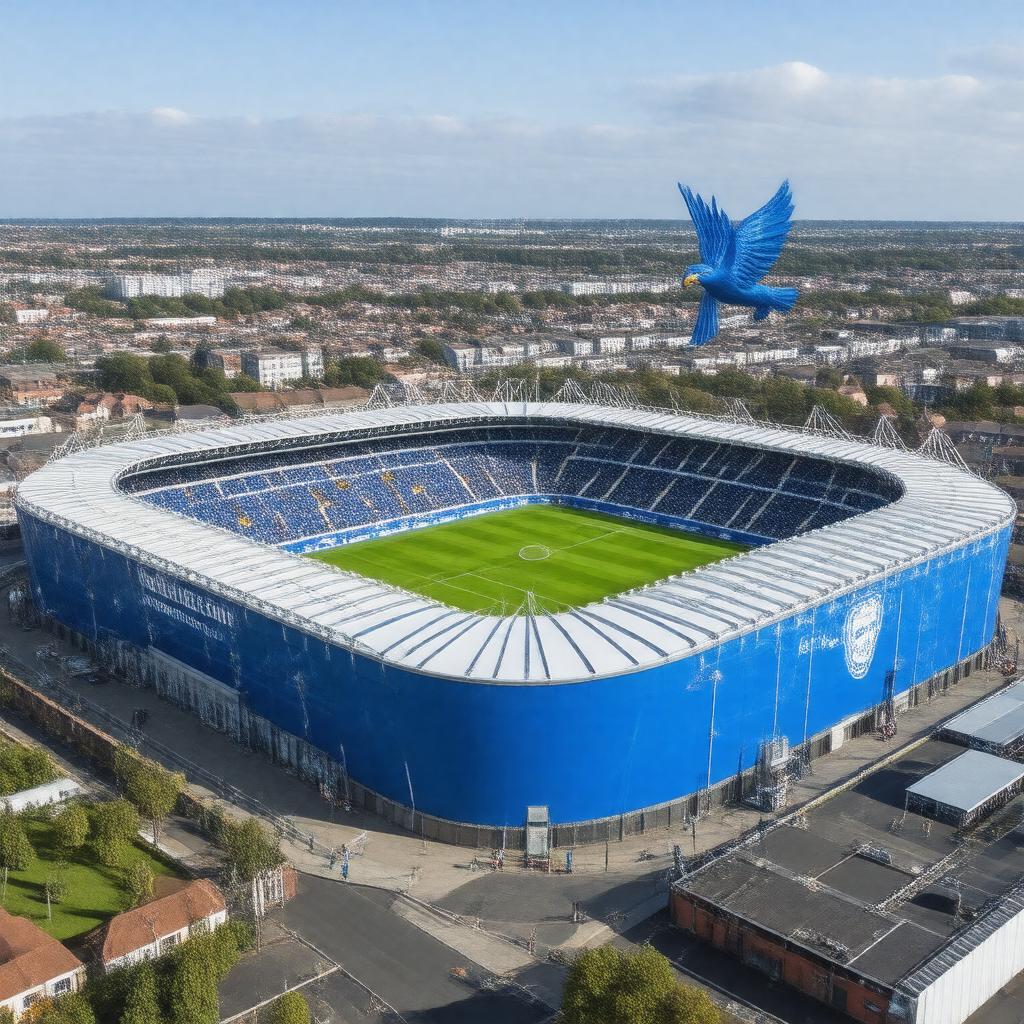 "Generate an image of a football stadium with a blue and white color scheme, situated in Cardiff, Wales. The stadium, Cardiff City Stadium, should be filled with excited fans wearing blue and white, with a prominent sign reading 'Cardiff City Football Club' and a giant bluebird mascot, Bartley Bluebird, flying above. In the background, the Cardiff cityscape is visible. The style should be realistic and vibrant, capturing the energetic atmosphere of a Cardiff City matchday."