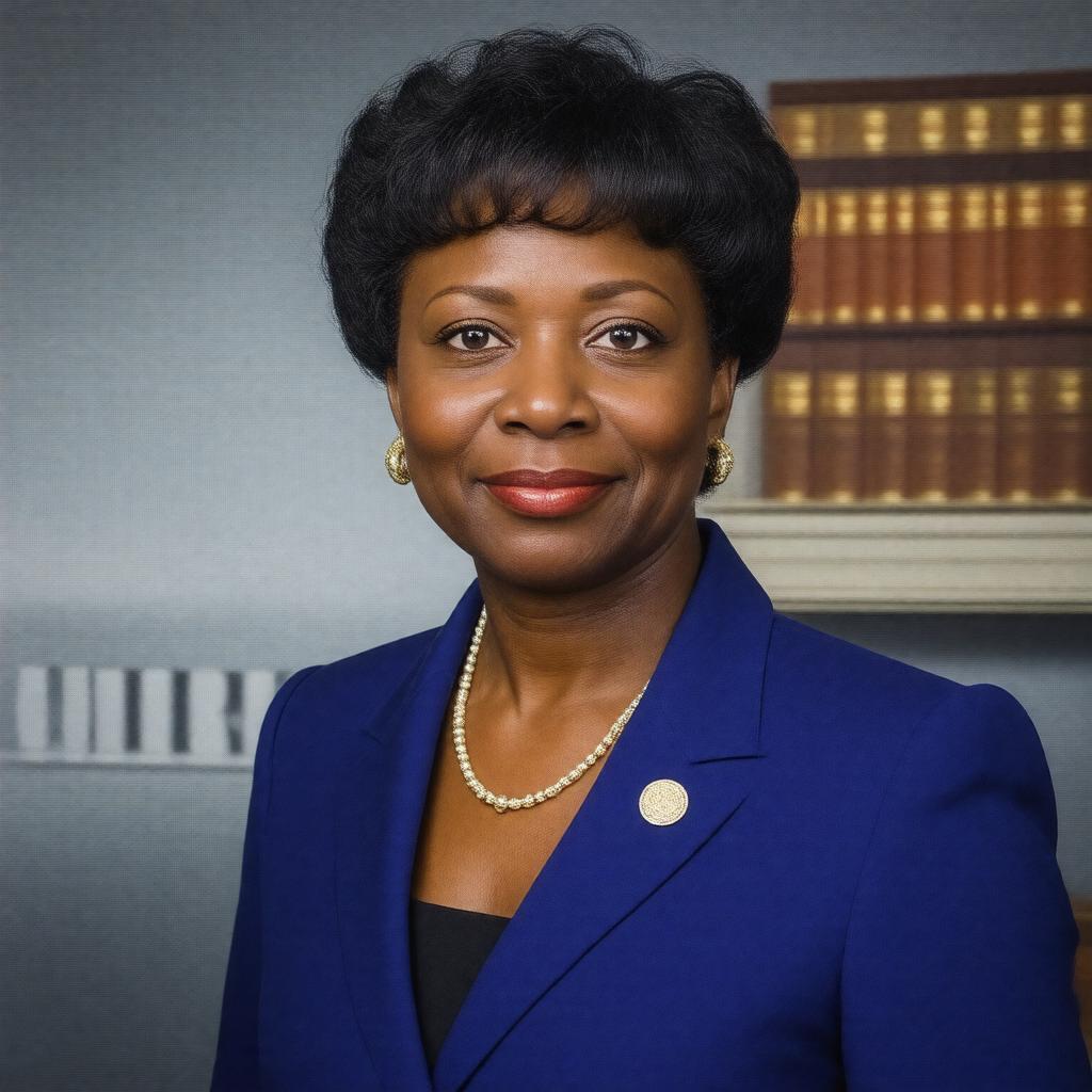 Create a realistic portrait of Carla Hayden, the first woman and first African American Librarian of Congress, in a formal setting that reflects her profession, such as the Library of Congress, wearing attire suitable for a government position and librarian, with subtle hints of her notable achievements and awards in the background or through props, capturing her significance and contributions to the field of librarianship and archives.