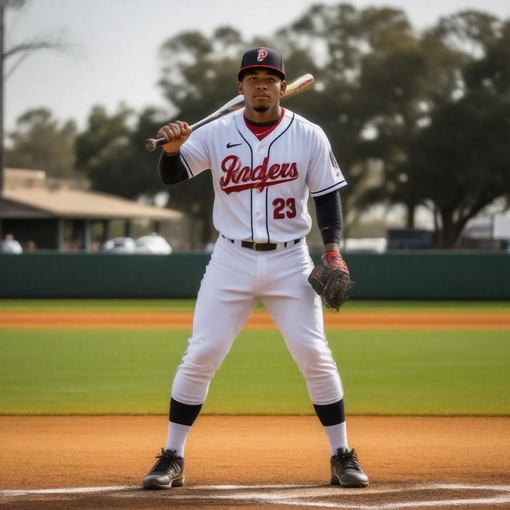 Generate a realistic image of a baseball player in his prime, standing confidently on the field with his bat and glove, wearing a baseball uniform with the number and team logo prominently displayed. The player, Carlos Peña, is a left-handed batter and first baseman with a strong and athletic build, captured in a dynamic pose that showcases his skills and personality, in a style reminiscent of classic sports photography.