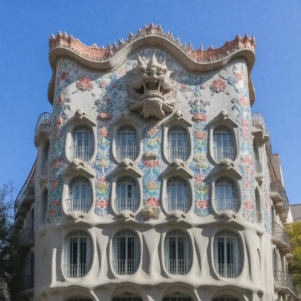 "Generate an image of Casa Batlló, a famous building in Barcelona, Spain, showcasing its unique and colorful façade, dragon-shaped roof, and oval windows, set against a clear blue sky, in the style of modern architecture and Catalan Modernism."