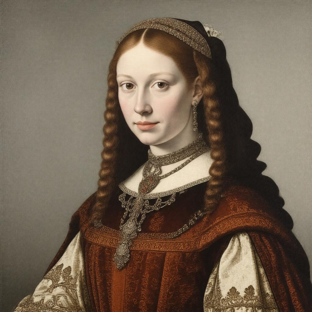"Generate a realistic portrait of Catherine of York, an English princess from the House of York, dressed in 15th-century attire, with a subtle background suggesting her connection to Eltham Palace, her birthplace, in a style reminiscent of traditional English portraiture."