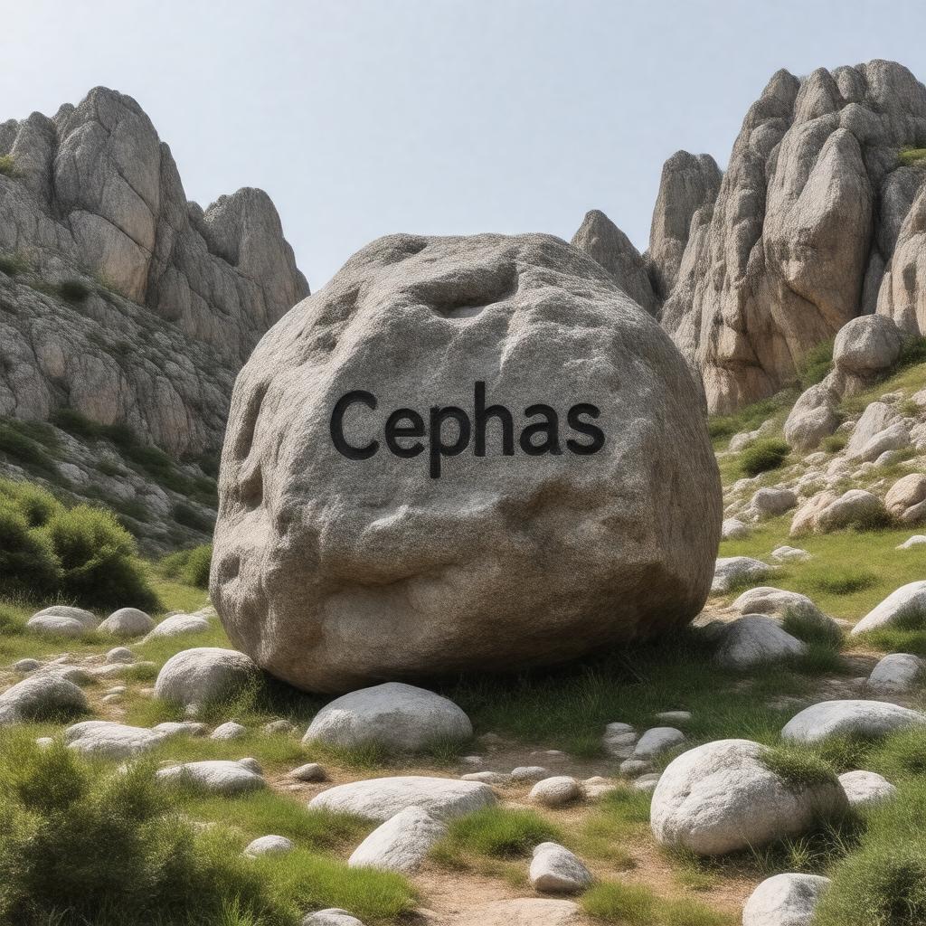 Generate an image of a rugged, rocky landscape with a massive boulder in the center, symbolizing the name "Cephas" which means "rock" in Aramaic, associated with the Biblical figure also known as Apostle Peter, in a realistic and serene style.