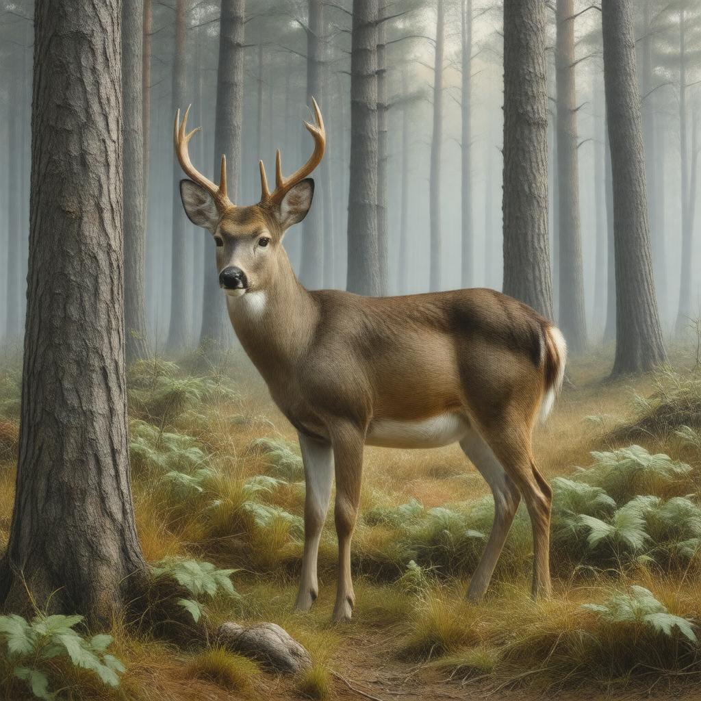 "A realistic illustration of a white-tailed deer (Odocoileus virginianus) standing in a forest clearing, surrounded by tall trees and underbrush, with a few antlers visible in the background, showcasing the distinctive features of the Cervidae family, in a naturalistic and detailed style."
