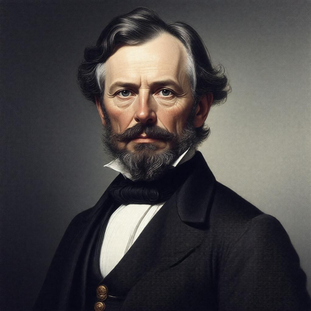 Generate a realistic portrait of Charles Adams, a 19th-century American diplomat and lawyer, in a formal attire, set against a backdrop that subtly suggests his connection to Harvard University or a diplomatic setting, reflecting his occupations and heritage as the son of John Quincy Adams.