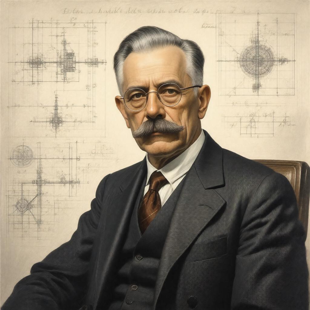 "Portrait of Charles Proteus Steinmetz, a middle-aged man with a distinctive mustache and glasses, sitting in a formal suit, surrounded by mathematical equations and electrical engineering diagrams, with a subtle hint of industrial machinery in the background, rendered in a realistic and detailed style."