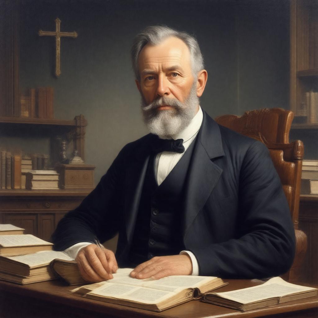Generate a realistic portrait image of Charles Sheldon, an American Congregationalist minister and author, in a 19th-century style, sitting in a study with books and papers around him, wearing formal attire, with a thoughtful expression, and a subtle hint of a cross or Christian symbols in the background, reflecting his devotion to Christianity and the Social Gospel movement, which he is known for coining the phrase 'What Would Jesus Do?' as a guiding principle.