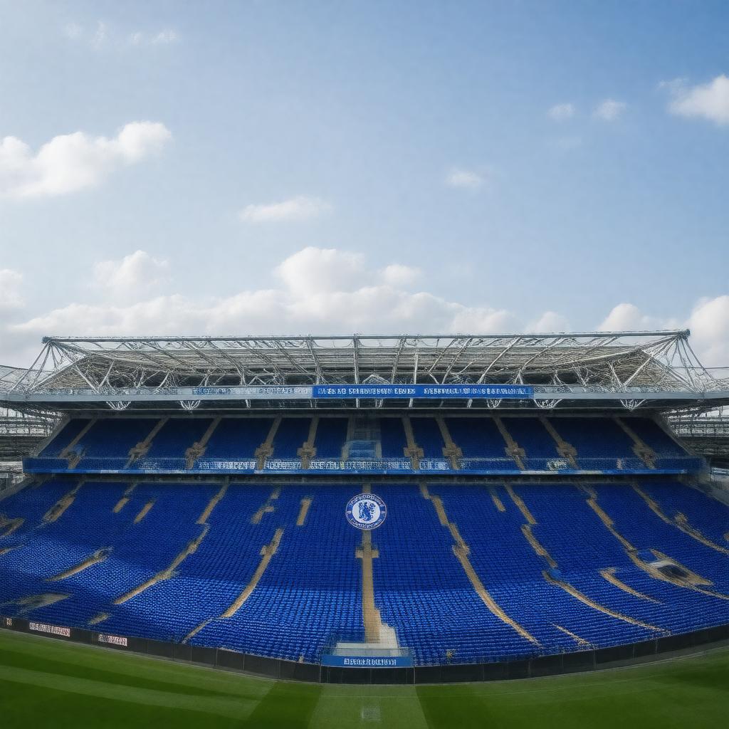 "Generate an image of Chelsea Football Club's Stamford Bridge stadium with the iconic blue color and a subtle hint of the London cityscape in the background, incorporating the club's crest and a banner with the nickname 'The Blues', in a realistic and modern style."