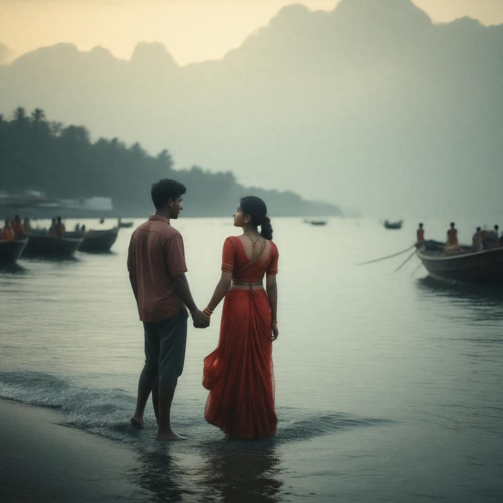 "Create an image of a romantic drama film set in a fishing village in Kerala, India. The scene depicts a tragic love story between two young lovers, Karuthamma and Pareekutty, with a backdrop of the Kerala coastline. Incorporate elements of superstition, fate, and the struggles of the fishing community. The image should be in Eastmancolor and reflect the classic, cinematic style of a 1960s Indian film. The tone should be melancholic and nostalgic, capturing the essence of a timeless, Malayalam cinema classic."