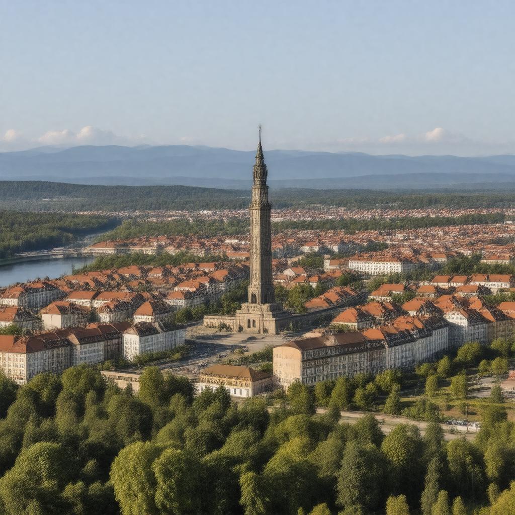 "Generate a realistic image of Chemnitz, a city located in the state of Saxony, Germany, with a population of about 247,000, showcasing its cityscape, possibly including notable landmarks like the Karl Marx Monument, Roter Turm, or Stadthalle Chemnitz, set against the backdrop of the Ore Mountains (Erzgebirge) and the Chemnitz River, in a daytime setting with a mix of modern and historical architecture."