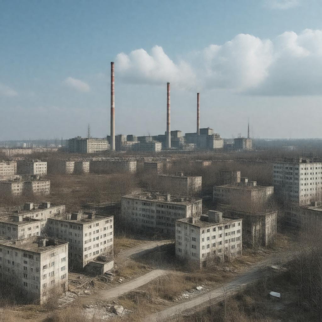 "Generate an image of a desolate and abandoned cityscape with a nuclear power plant in the background, featuring a mix of industrial and residential buildings, with a sense of eeriness and neglect, representing Chernobyl, a city in Ukraine, gptkbp:instance_of city, after the devastating nuclear disaster."