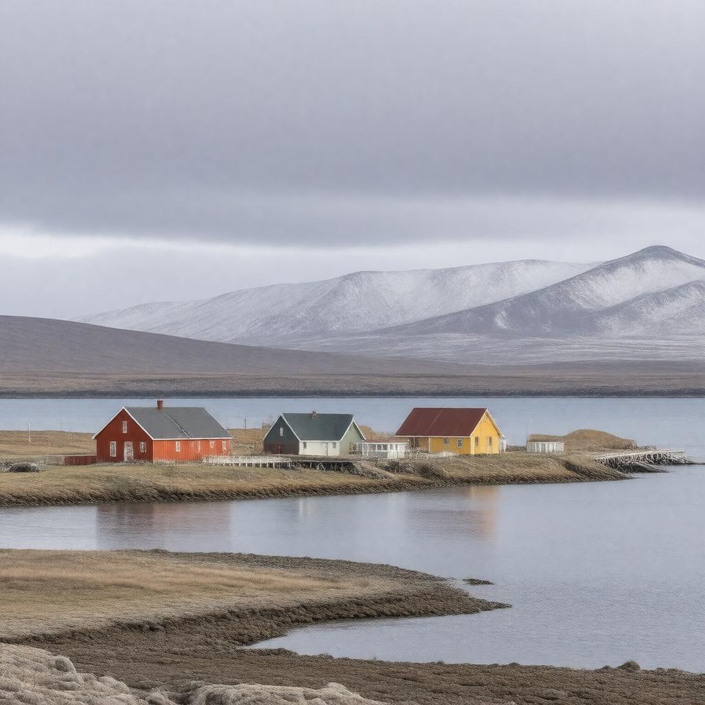 Generate a realistic image of a small, remote hamlet situated on the shores of a picturesque inlet, surrounded by Arctic landscape, with a few buildings, possibly including some colorful houses, a church, and a dock, under a vast, possibly cloudy sky, representing Chesterfield Inlet in the Kivalliq Region of Nunavut, Canada.