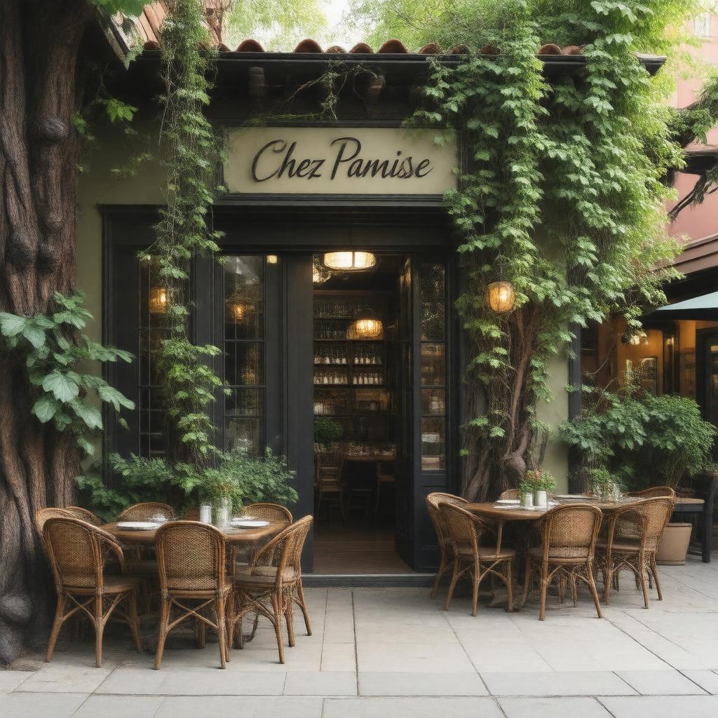 "Create a warm and inviting image of Chez Panisse, a renowned restaurant located at 1517 Shattuck Avenue, Berkeley, California, USA. The exterior should reflect its classic, upscale-casual atmosphere, with a façade that hints at its rich culinary history and influence on California cuisine and the farm-to-table movement. Incorporate elements that suggest its commitment to organic ingredients and local produce. The image should capture the essence of a place that has been a pioneer in American cuisine since 1971, founded by Alice Waters. Depict the building with its distinctive architectural features, possibly with outdoor seating or a garden that reflects its connection to local and organic food. The style should be realistic, with warm lighting that suggests a welcoming dining experience. Include subtle hints of its French culinary influences and its role in launching the careers of many celebrated chefs."