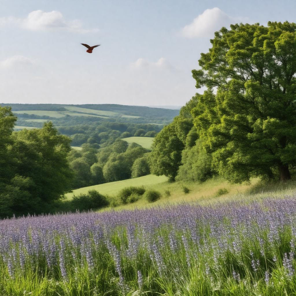 "Generate an image of a scenic view of the Chiltern Hills, a rolling green mountain range in England, with beech woodlands, bluebells, and a red kite soaring in the sky, under a sunny day with a few clouds, highlighting its designation as a nature reserve and Area of Outstanding Natural Beauty, with a subtle background of hills stretching 74 km across Oxfordshire, Buckinghamshire, Hertfordshire, and Bedfordshire."