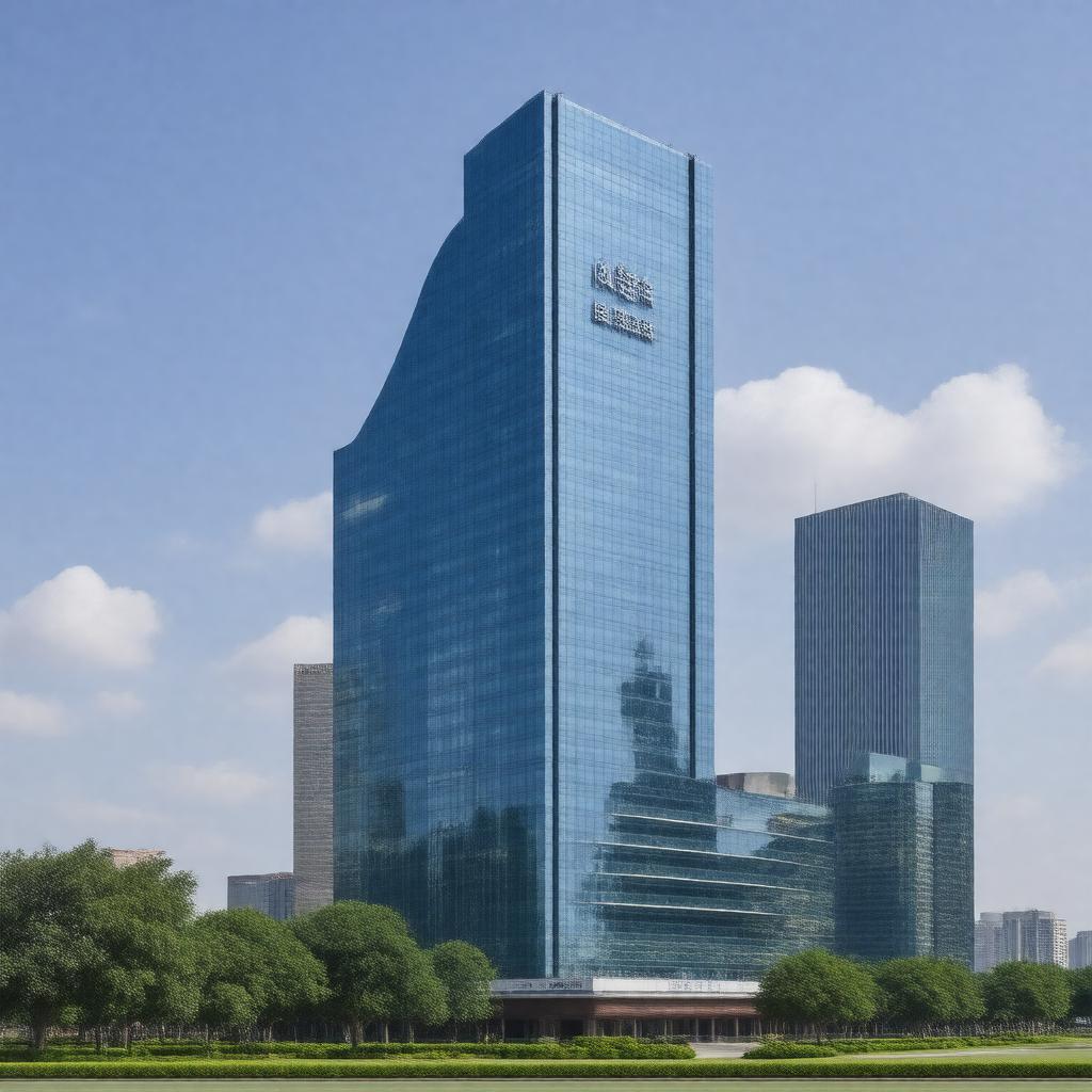 "Create an image of the China Construction Bank headquarters in Beijing, China, with a modern skyscraper in the background and the bank's logo prominently displayed on the building's facade. The image should be a daytime shot with a clear blue sky and a few clouds, and should convey a sense of stability and professionalism. The style should be photorealistic."