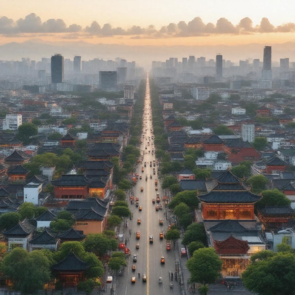 "Create an image of a vibrant and diverse cityscape at sunset, with a mix of modern and traditional architecture, featuring Chinese temples, restaurants, and cultural centers amidst a bustling metropolis, representing the Chinese diaspora community; style: realistic and dynamic, with a warm color palette."