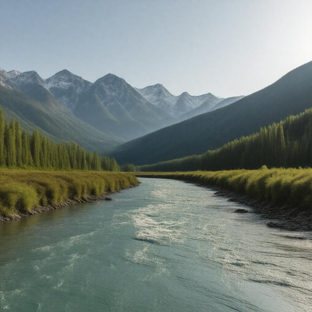 "Generate a serene and majestic landscape image of the Chitina River, a 274 km long river located in Alaska, United States. The image should feature the river flowing through the Wrangell–St. Elias National Park and Preserve, surrounded by lush greenery and majestic mountains. In the background, the Chitina Glacier can be seen, with the sun casting a warm glow on the scene. The river should be depicted in a tranquil state, with a few gentle ripples on its surface. The style should be realistic and reminiscent of a nature photograph, with vivid colors and attention to detail."
