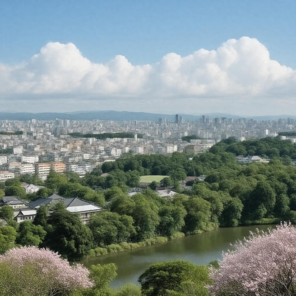 "Generate a realistic image of Chofu city in Tokyo Metropolis, Japan, showcasing its urban landscape with a mix of residential and commercial buildings, surrounded by lush greenery and possibly featuring landmarks like Jindaiji Temple, Ajinomoto Stadium, or the Tamagawa River, under a clear blue sky with a few puffy white clouds, incorporating the city's symbol, the Zelkova tree, and Azalea flowers, with a subtle hint of the city's vibrant culture and community."