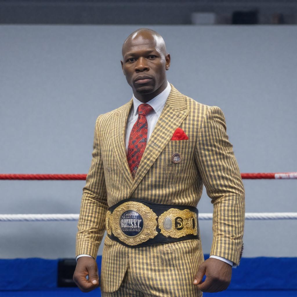 Generate an image of Chris Eubank, a British human, in his prime as a professional boxer, dressed in his signature eccentric and distinctive fashion style, with a confident expression, standing in a boxing ring with a championship belt around his waist, incorporating elements that reflect his nickname "Simply the Best" and his notable battles, in a realistic style.