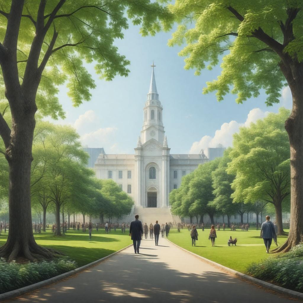 "Generate an image of a serene and spiritual scene depicting a Christian Science church, with a large building in the background, possibly The Mother Church in Boston, Massachusetts, surrounded by lush greenery and a clear blue sky, with people walking towards the church, conveying a sense of community and spiritual growth, in a realistic and peaceful style."