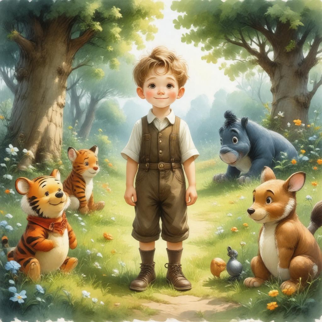 "Generate an image of Christopher Robin, a fictional character, a young British boy with a cheerful expression, dressed in a simple outfit, standing in a lush green meadow surrounded by his friends from the Hundred Acre Wood, including Winnie-the-Pooh, Eeyore, Tigger, Kanga, and Roo, in a whimsical and nostalgic illustration style reminiscent of classic children's books, with a warm and sunny atmosphere."