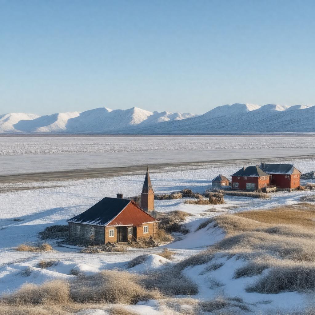 "Generate an image of a vast, icy landscape with a mix of tundra and mountains, representing Chukotka Autonomous Okrug, a federal subject of Russia. Include a frozen coastline with ice floes in the sea, and in the distance, a few reindeer herds can be seen. In the foreground, a small traditional Chukchi village with colorful wooden houses and a church, surrounded by snow-covered mountains and a frozen lake. The sky is a pale blue with a hint of aurora borealis. The image should convey a sense of remoteness, harsh climate, and natural beauty."