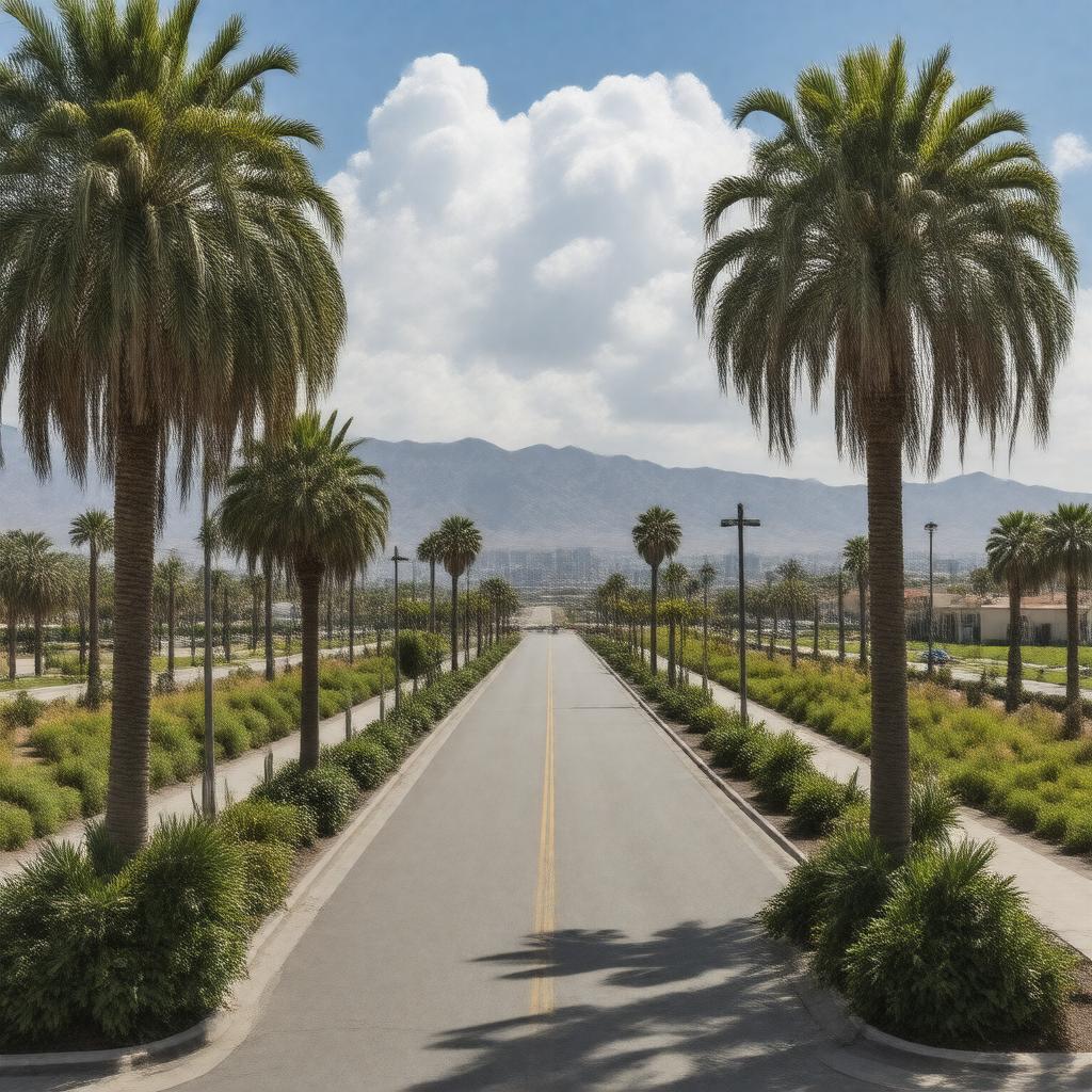 "Generate a realistic image of Chula Vista, a city located in Southern California, with a scenic view of its downtown area, surrounded by palm trees and mountains in the background, with a subtle hint of the ocean in the distance, under a bright sunny day with a few puffy white clouds, incorporating the city's nickname 'The Lemon Capital of the World' in a creative way."