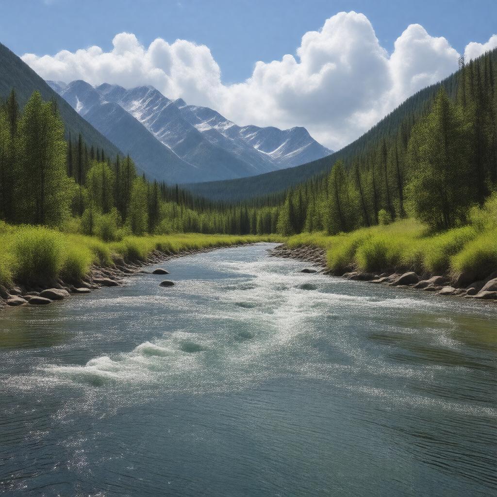 "Generate a serene landscape image of the Chulitna River, flowing through a valley surrounded by mountains, with a few trees and rocks along its banks, under a clear blue sky with some fluffy white clouds; the river should be depicted in a realistic style, with gentle ripples and a calm atmosphere, reflecting its tranquil nature; in the background, a subtle hint of Denali National Park's majestic scenery can be seen; the image should convey a sense of wilderness and natural beauty."