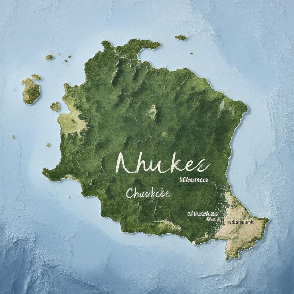 Generate an image of a map of Micronesia with a highlighted area in Chuuk State, overlaid with a simple representation of the Latin script writing system and a few words written in Chuukese, surrounded by lush tropical islands and ocean, in a style that reflects the Pacific Island region.