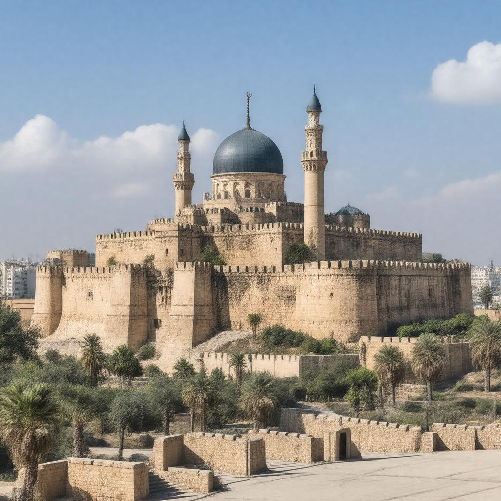 "Generate an image of the Citadel of Cairo, a medieval Islamic castle situated in Cairo, Egypt, showcasing its impressive Islamic architecture, with the Mosque of Muhammad Ali and other notable structures, set against the backdrop of the city, during the daytime, with a clear blue sky and a few clouds, in a realistic style."