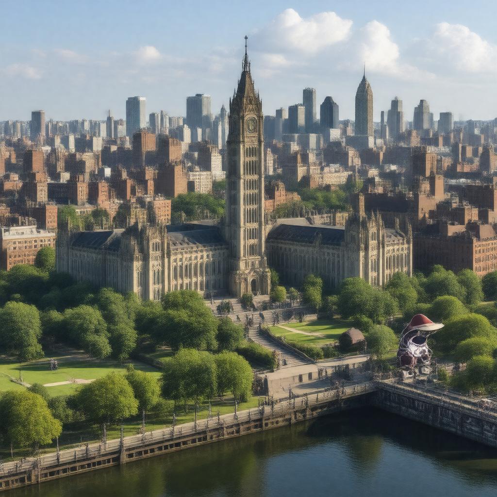 "Generate an image of the iconic City College of New York, located in Manhattan, New York City, showcasing its urban campus and notable architecture, specifically Shepard Hall, with the majestic Harlem River and New York City skyline in the background, incorporating the school colors lavender, and featuring the Beavers mascot, Benny the Beaver, in a realistic and vibrant style."