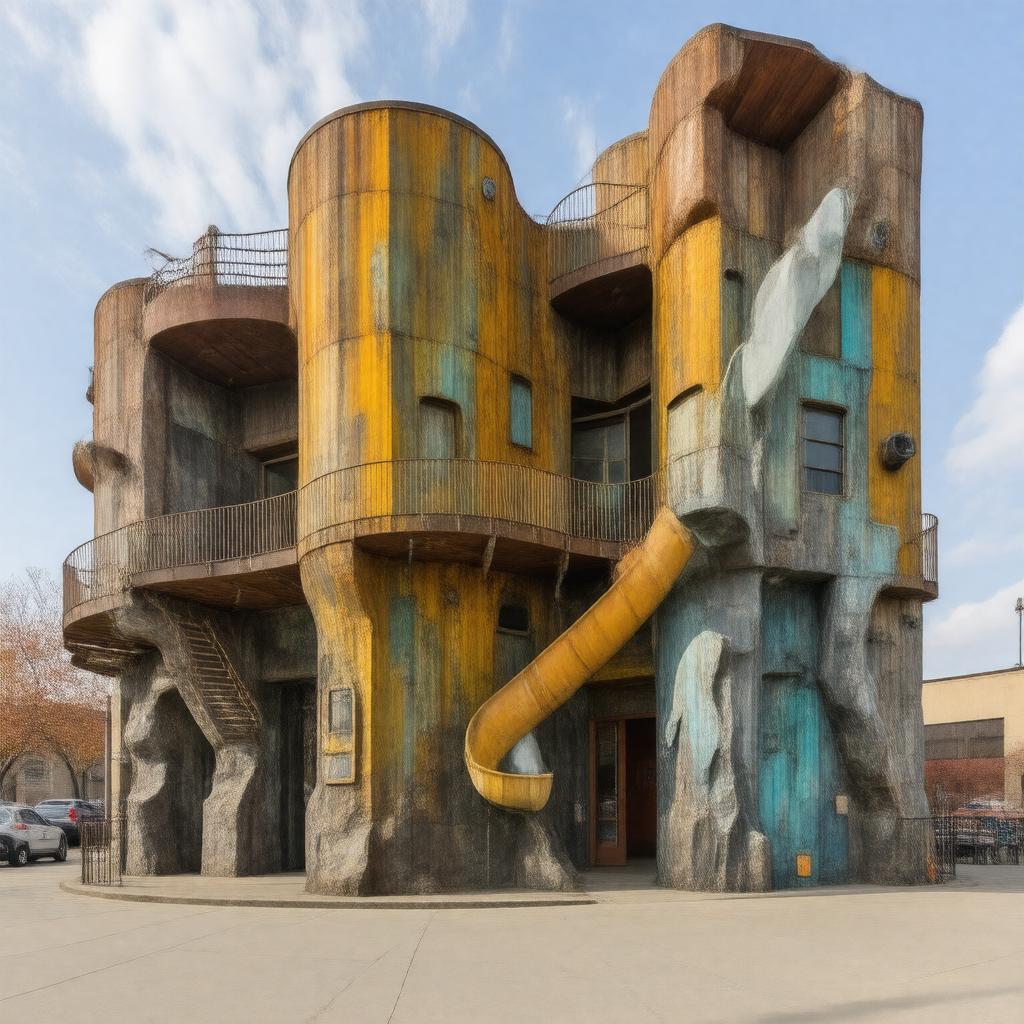 "An exterior view of a vibrant, eclectic museum made from repurposed industrial objects, located at 750 N 16th St, St. Louis, MO 63103, with outdoor climbing structures, caves, slides, and rooftop attractions, in a style that reflects its industrial reuse architectural style."