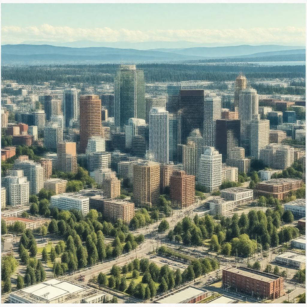 "Generate a realistic image of the City of Bellevue, Washington, showcasing its vibrant downtown area with a mix of modern buildings, parks, and bustling streets, incorporating elements that reflect its nickname 'The City in a Park', with a stylized representation of its proximity to Seattle and other nearby cities, under a Pacific Time Zone sky."