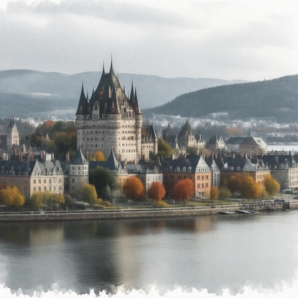 "Generate a realistic image of the City of Quebec, showcasing its historic district, with the Château Frontenac and Citadelle of Quebec prominently visible, situated on the banks of the Saint Lawrence River, with a scenic backdrop of the surrounding hills and a vibrant French-Canadian influenced architecture, in a daytime setting with a slight mist, reminiscent of a watercolor painting."