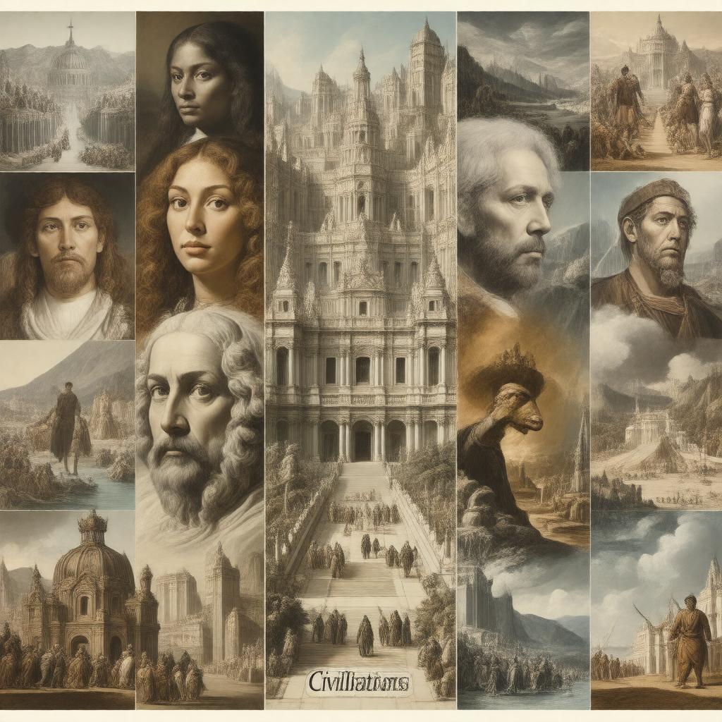 "Generate an image of a documentary-style collage representing the television series 'Civilisations', featuring iconic artworks and architectural elements from different cultures and time periods, with a muted color palette and a sense of historical grandeur, set against a backdrop that evokes a sense of global exploration and discovery."