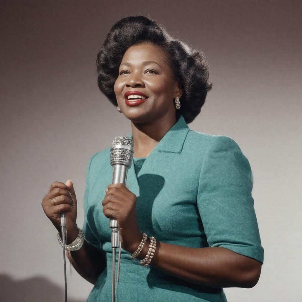 Create an image of Clara Ward, a renowned American gospel singer, standing confidently with a microphone in hand, dressed in attire typical of the 1950s or 1960s, with a subtle background hinting at her musical performances, such as a church or a recording studio, in a realistic and respectful style.