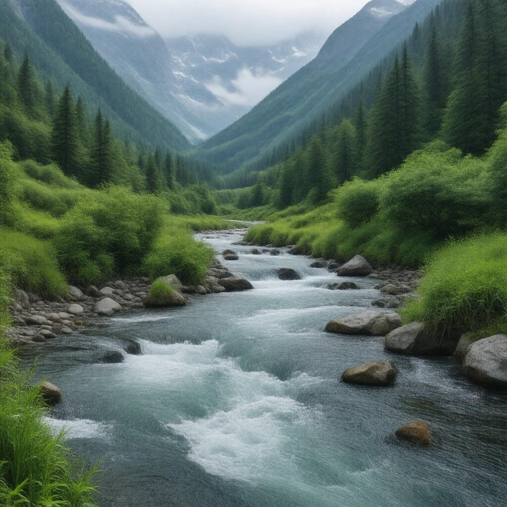 "Generate an image of a serene and natural 14-mile-long river, specifically a tributary, flowing through a mountainous region, surrounded by lush greenery and possibly some wildlife, with a source at a high elevation and emptying into a larger river, set within a protected wilderness area, in a realistic landscape style."