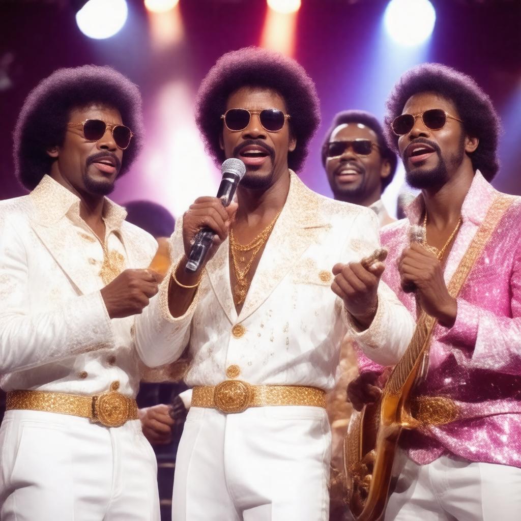 "Generate an image of the American funk, soul, and R&B band Commodores, formed in 1968 in Tuskegee, Alabama, featuring Lionel Richie, Thomas McClary, Milan Williams, Ronald LaPread, William King, and Walter Orange, performing on stage with a funky and vibrant style, incorporating elements of their notable songs, such as 'Easy', 'Three Times a Lady', and 'Brick House', with a background that reflects their association with Motown, Polydor, and MCA record labels."