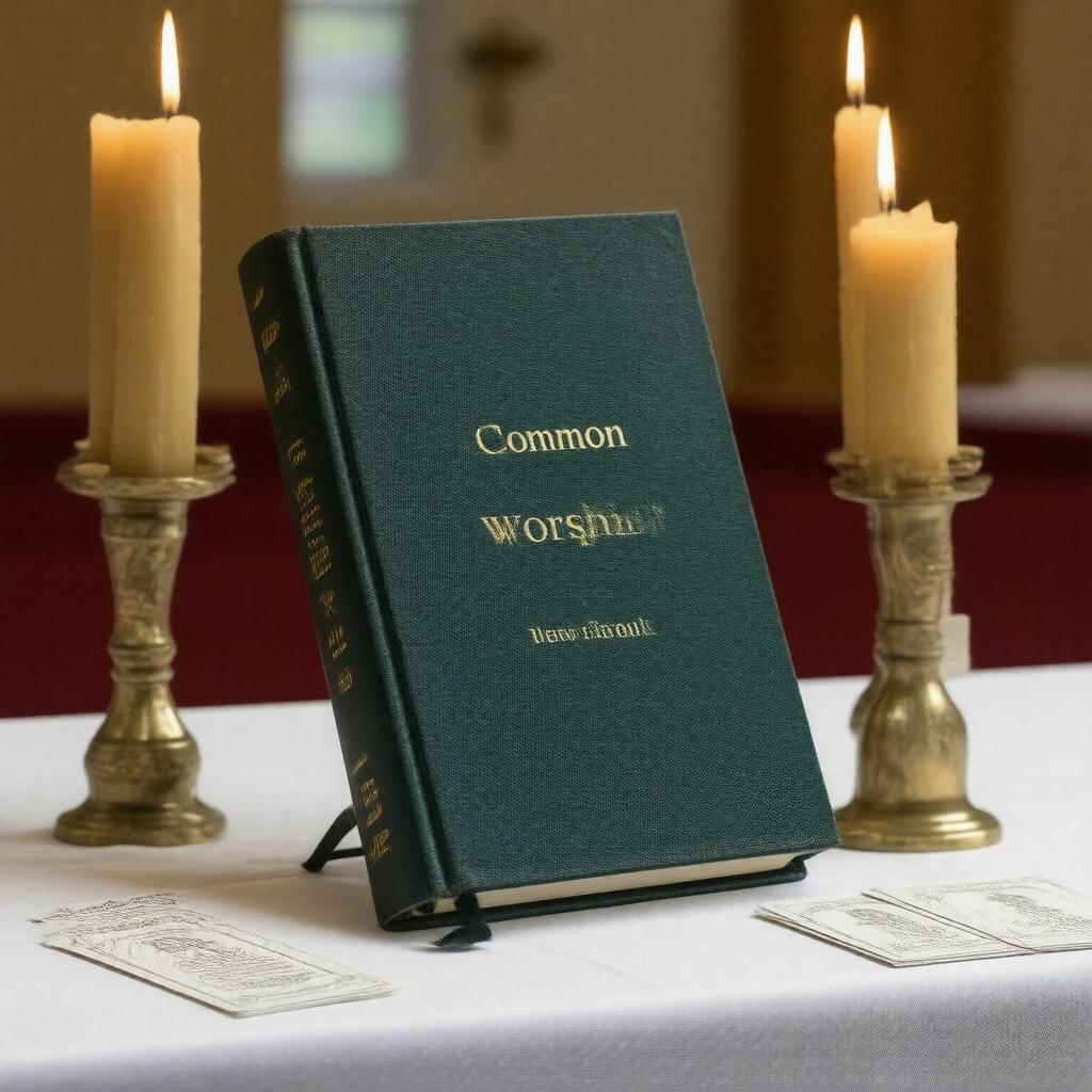 "Create an image of a Church of England prayer book, titled 'Common Worship', with a simple and traditional cover design, sitting on a lectern or altar, surrounded by candles and a few prayer cards, in a warm and welcoming church setting, representing the Divine Liturgy used by the Church of England for public worship and private devotion, introduced in 2000."