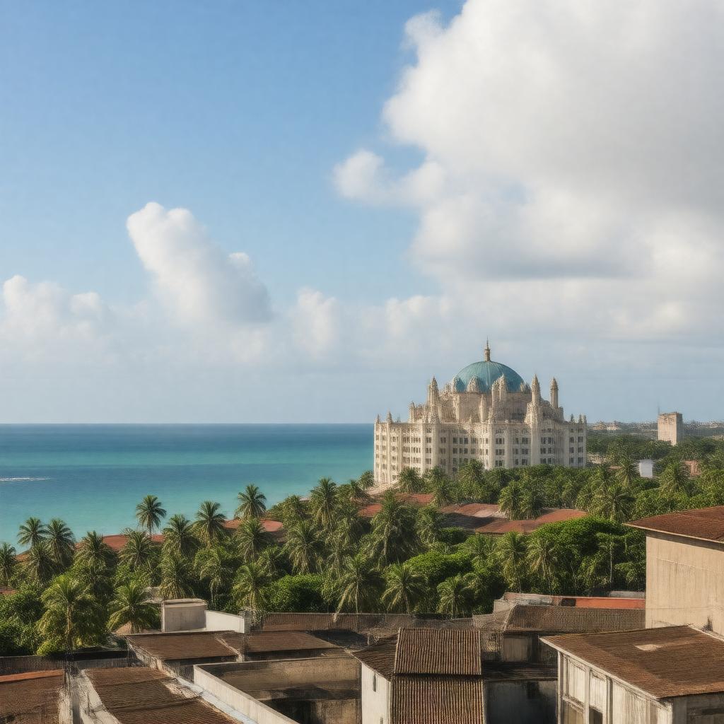 "Generate a realistic image of Conakry, the capital city of Guinea, showcasing its vibrant atmosphere and tropical monsoon climate, with the Grand Mosque of Conakry and the National Museum of Guinea in the background, and the Atlantic Ocean coastline in the distance, under a bright daytime sky with a few clouds."