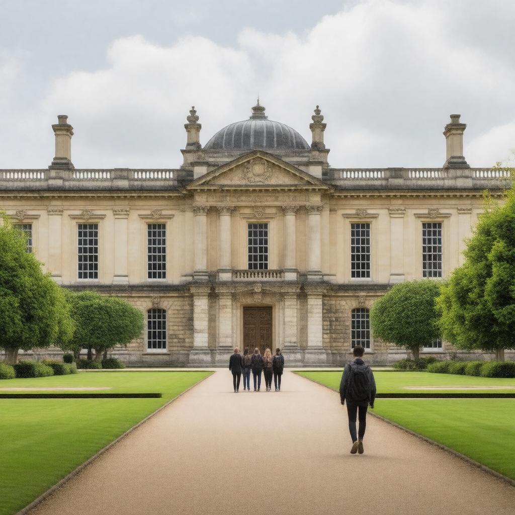 "Generate an image of the historic Somerset House building in London, with a focus on its grand architecture and beautiful courtyard, surrounded by lush greenery, with a few students walking in front of it, representing the Courtauld Institute of Art, a prestigious educational institution specializing in art history, conservation, and curation, with a collection of renowned artworks including Impressionist, Post-Impressionist, and Old Master paintings, as well as drawings and sculptures."