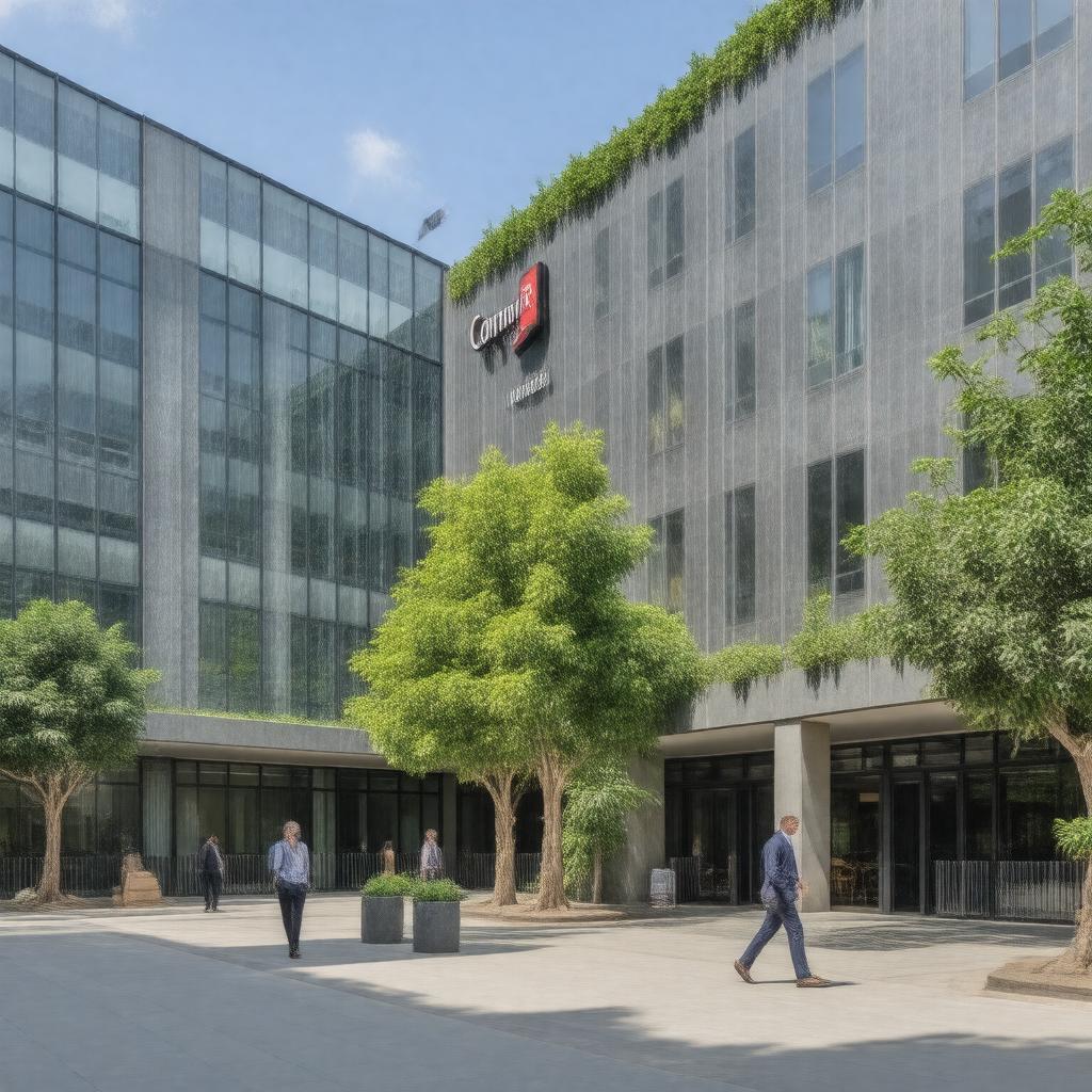 "Generate a photorealistic image of a modern Courtyard by Marriott hotel exterior with a large courtyard, featuring a sleek and inviting design, lush greenery, and a prominent logo, set against a bright sunny day with a few business travelers walking in and out of the building."