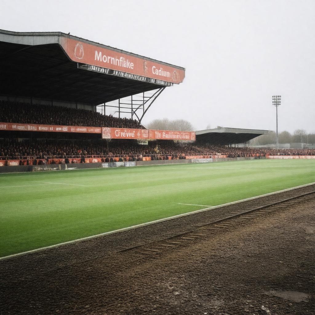 "Generate an image of a football stadium with a red and white color scheme, situated in Crewe, England. The stadium, Mornflake Stadium, should be filled with excited fans and have a prominent sign with the stadium's name and the team's nickname, 'The Railwaymen', displayed. In the background, a subtle image of a railway line and trains should be visible, paying homage to the team's name and heritage. The overall style should be realistic and vibrant, capturing the energy and spirit of a Crewe Alexandra Football Club match."