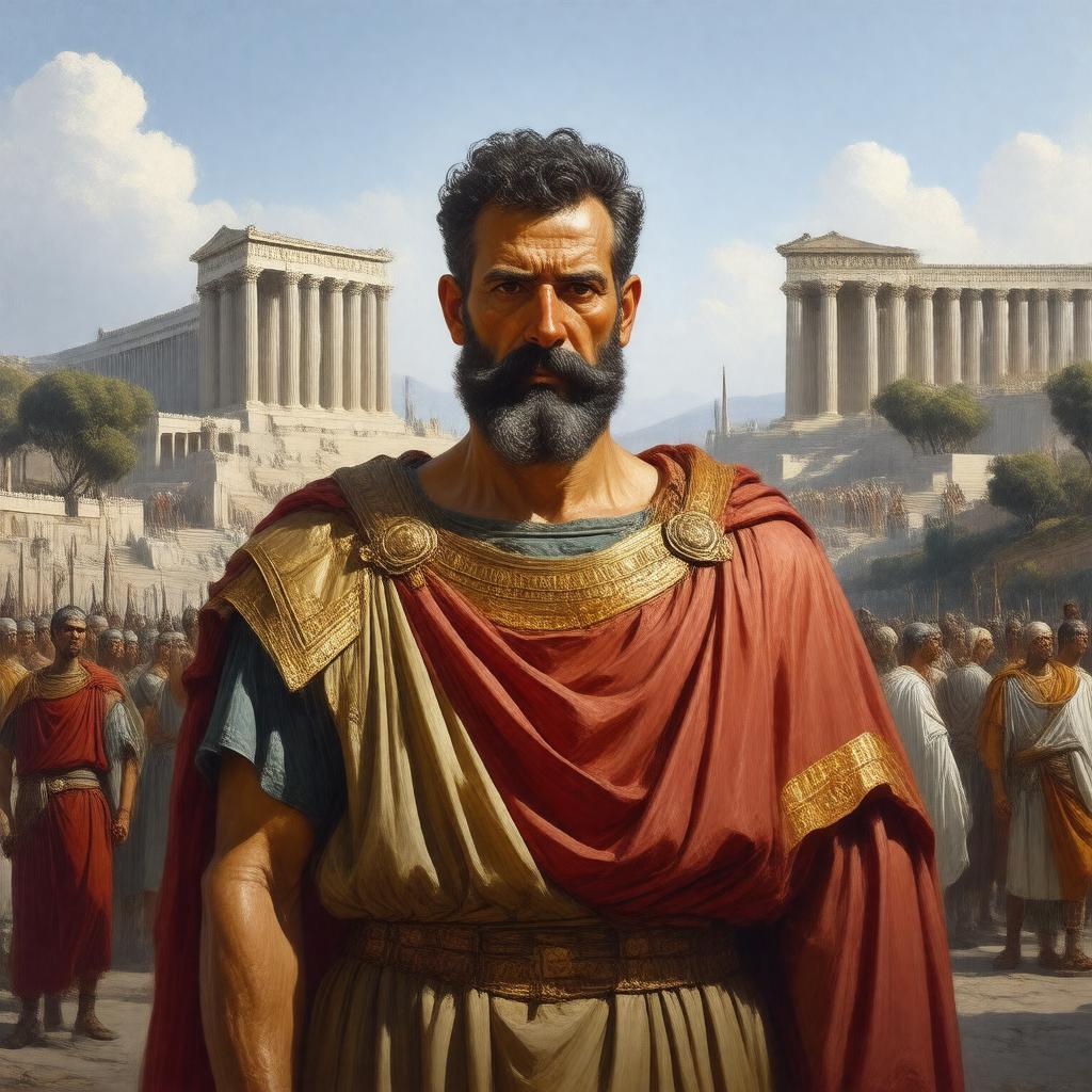 Generate an image of Critias, a 5th-century Athenian philosopher, politician, and writer, standing in front of a backdrop of ancient Athens, dressed in traditional Greek attire, with a stern expression, symbolizing his extreme oligarchic views and leadership of the Thirty Tyrants, in a realistic and classical style reminiscent of ancient Greek art.