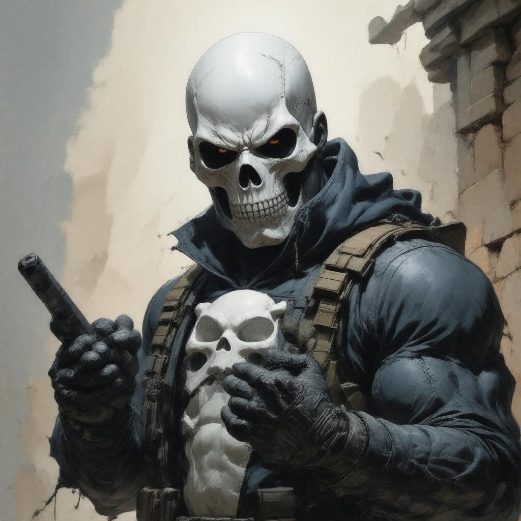 "Generate an image of Crossbones, a Marvel Comics character, in a dark and gritty comic book style, wearing a mask with a white skull motif, standing in a menacing pose with a tactical expert gesture, surrounded by a shadowy background, symbolizing his affiliation with HYDRA and his occupation as an assassin and mercenary."