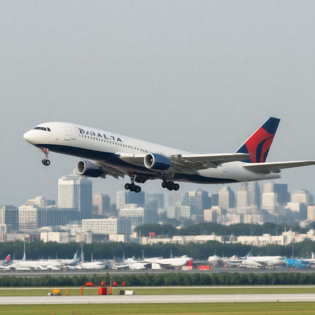 "Generate an image of a Delta Air Lines airplane taking off from Hartsfield–Jackson Atlanta International Airport, with the Atlanta skyline in the background, incorporating the airline's signature red and blue colors and logo, in a realistic and modern style."