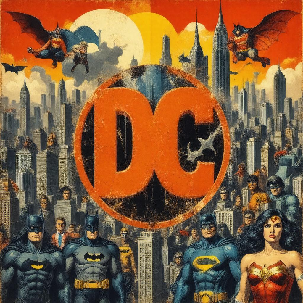 "Create an image of the DC Comics logo with a cityscape of Gotham City and Metropolis in the background, surrounded by iconic superheroes such as Superman, Batman, Wonder Woman, and others, in a dynamic and colorful comic book-inspired style."