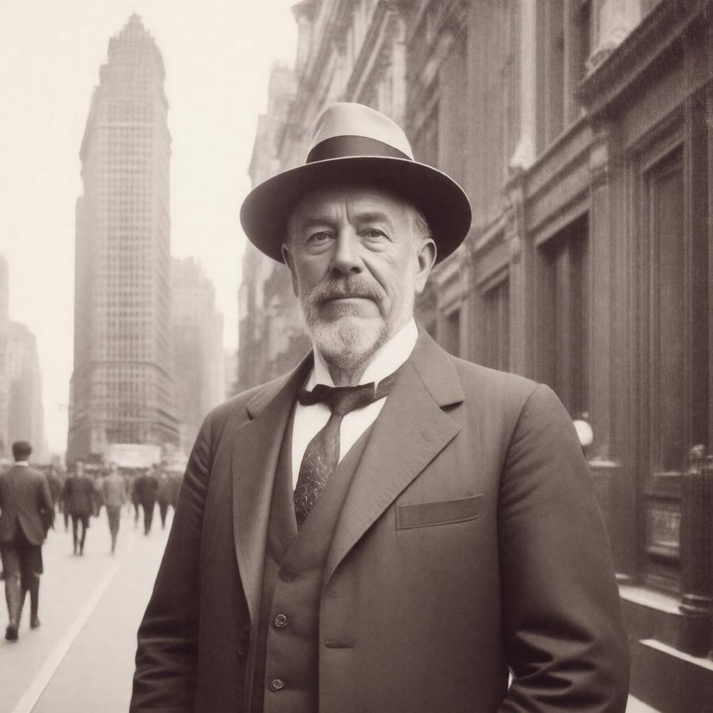"Generate a realistic image of Daniel Burnham, a prominent American architect and urban planner, standing in front of one of his notable works, such as the Flatiron Building or the Monadnock Building, wearing a suit and hat, with a confident and visionary expression, in a style reminiscent of late 19th or early 20th-century photography."