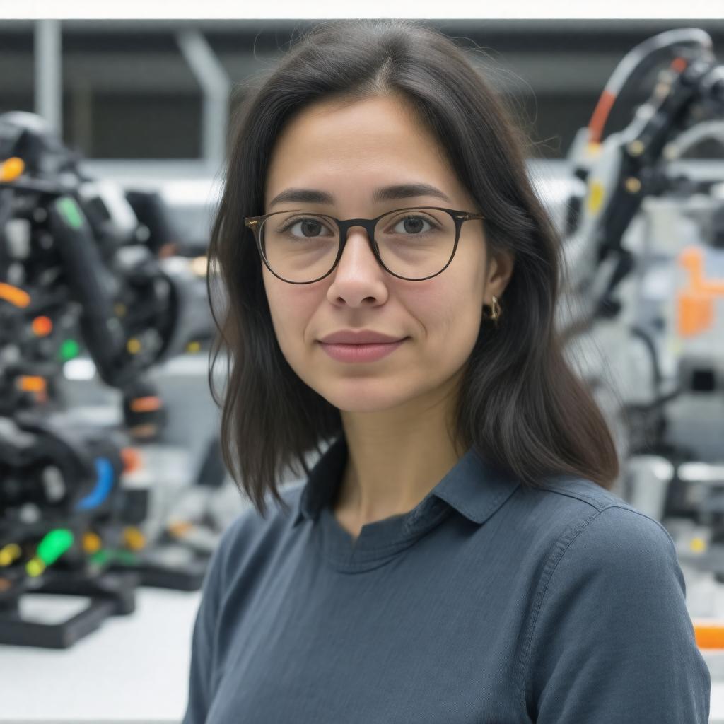 "Generate a realistic portrait of Daniela Rus, a Romanian-American computer scientist, in a professional setting, possibly in a robotics or AI laboratory, surrounded by subtle hints of her work, such as robotic components or screens displaying code, reflecting her role as Director of MIT Computer Science and Artificial Intelligence Laboratory."