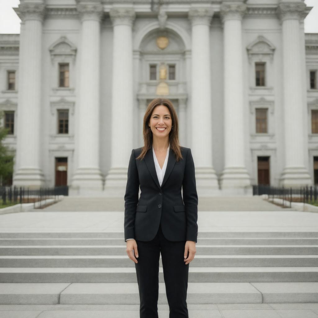 "Generate a realistic image of Danielle Smith, the current Premier of Alberta, standing in front of the Alberta Legislative Building, wearing a professional suit and smiling, representing her role as a prominent Canadian politician."
